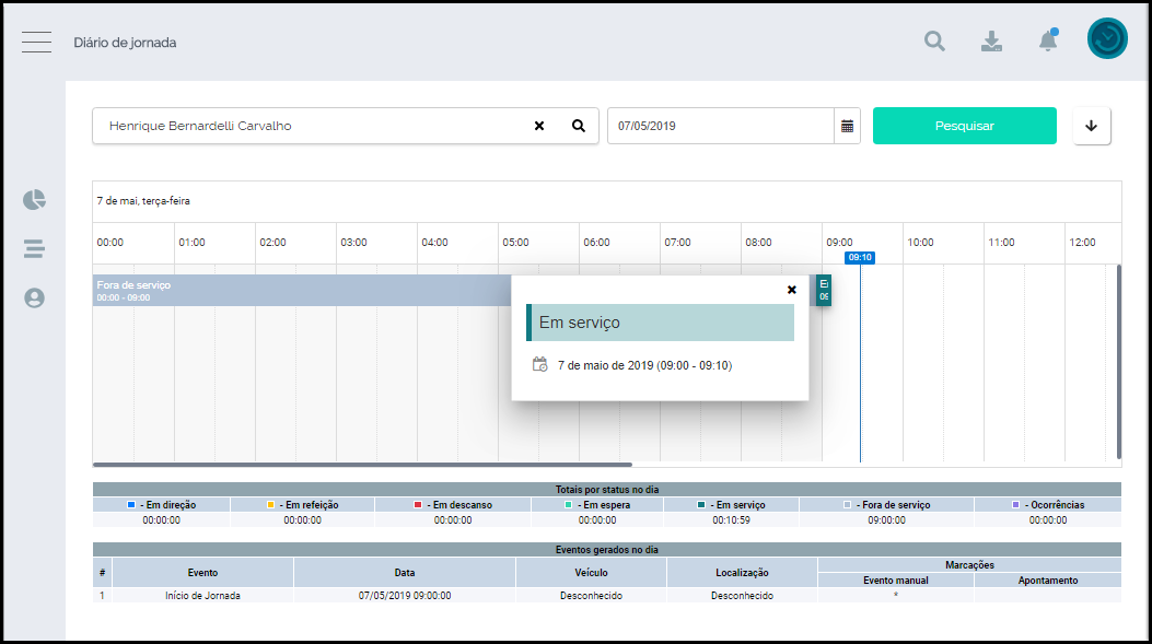 •Será exibida uma linha do tempo, do dia selecionado no filtro, com todos os eventos e ocorrências que ocorreram naquele dia, para o motorista em questão;