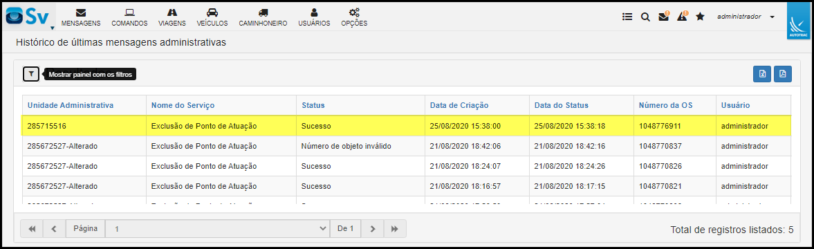 Foi implementada uma melhoria no histórico de mensagens administrativas para saber quem e quando realizou a exclusão de um ponto de atuação.