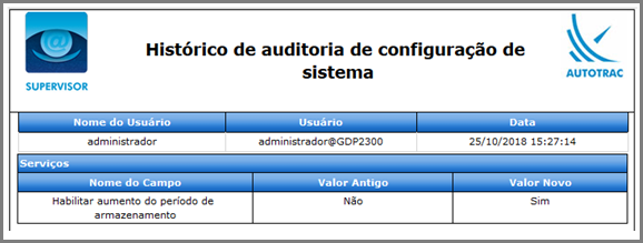 Sempre que o serviço for ativado ou desativado será registrado na auditoria de configuração do sistema.