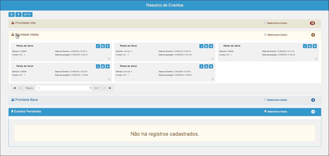 Além das prioridades, existe a categoria “Eventos Pendentes”, que mostrará os eventos que ainda não foram devidamente tratados ou marcados como Pendente.