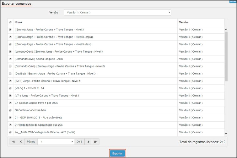 A aplicação irá exibir a tela "Exportar comandos", selecione o tipo de versão dos comandos no campo Versão, em seguida marque os registros desejados, e acione o botão "Exportar".