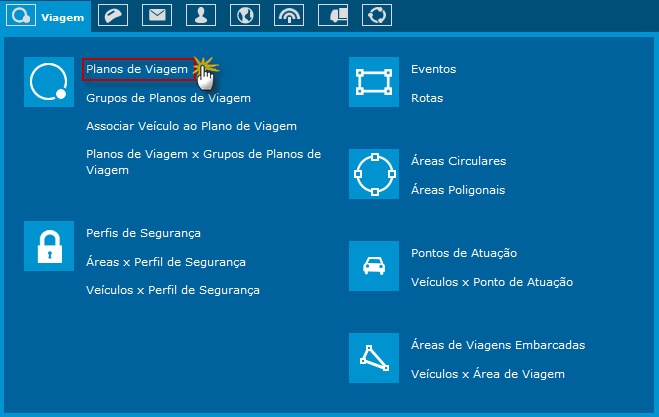 Para criar um Plano de Viagem, é necessário acessar o menu viagem->planos de viagem.